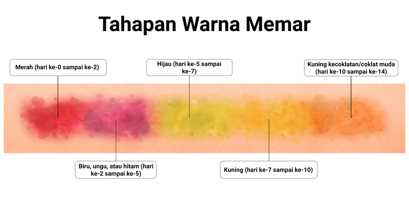 Selama proses penyembuhan, memar biasanya akan berubah warna mengikuti tahapan-tahapan. Berikut arti warna memar berdasarkan tahapan penyembuhannya: