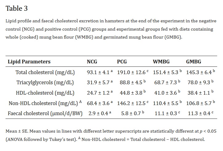Hasil dari penelitian ini menunjukkan bahwa kacang hijau, baik dalam bentuk utuh maupun sudah berkecambah (tauge), menunjukkan efek penurun kolesterol yang signifikan.