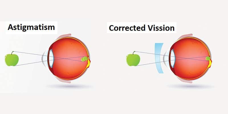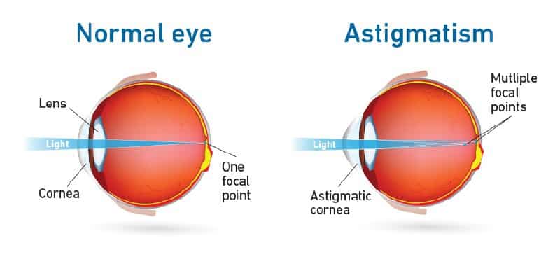 Jika kornea atau lensa mata Anda berbentuk telur dengan dua kurva yang tidak cocok, maka sinar cahaya tidak dapat dibengkokkan dengan benar. Hal ini menyebabkan kesalahan bias atau kesalahan pembelokan cahaya.