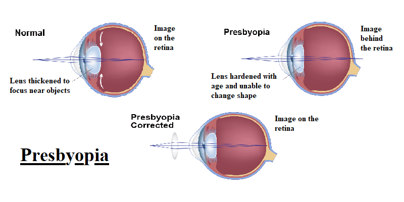 Perubahan yang berkaitan dengan usia terjadi karena protein di lensa, sehingga lensa menjadi lebih keras dan kurang elastis. Perubahan yang berkaitan dengan usia juga terjadi di serat otot di sekitar lensa. Dengan kurangnya elastisitas, maka mata akan kesulitan untuk fokus lebih dekat.