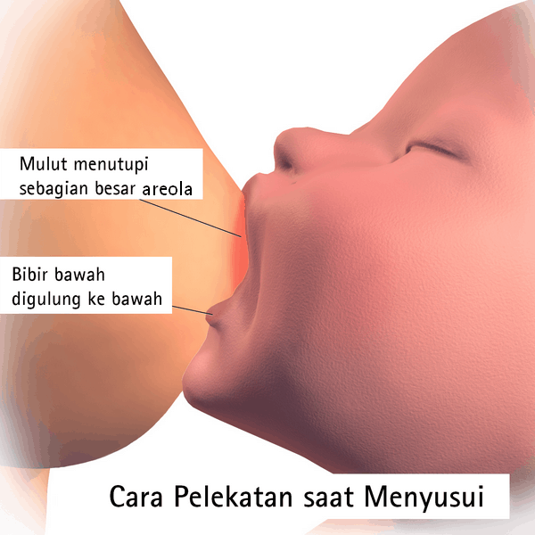 - Mulut bayi melebar dan memenuhi mulutnya dengan payudara.